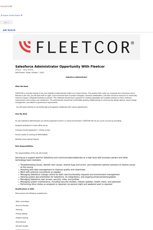 Salesforce Administrator With Fleetcor Job At Fleetcor 57727478 Tapwage Job Search